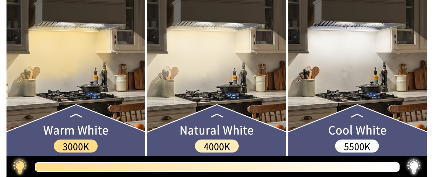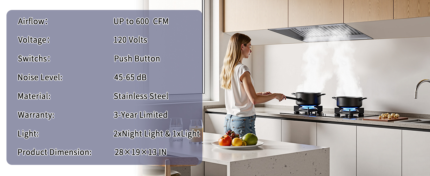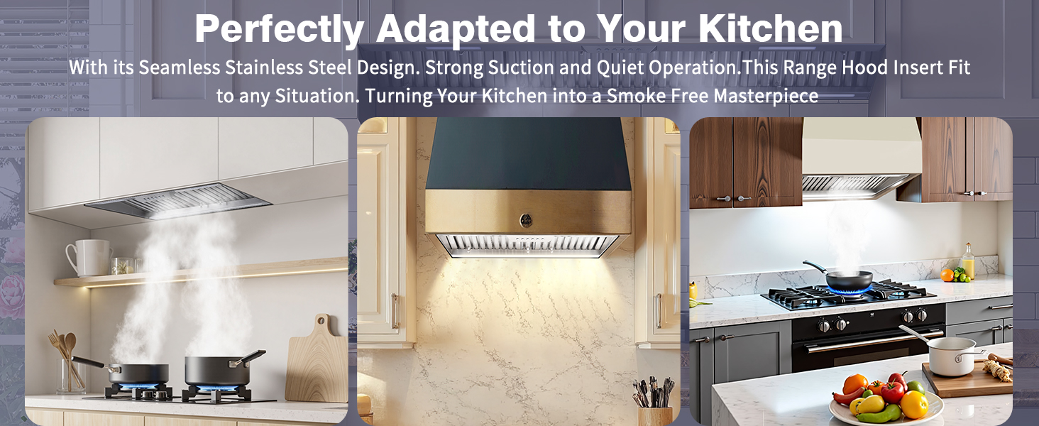 LED Light: Kitchen vent hood insert is Equipped with energy-efficient 3CCT LED lights (yellow,soft white, cool white) provide bright, flicker-free illumination. enhancing visibility during meal prep while creating a cozy atmosphere for gatherings