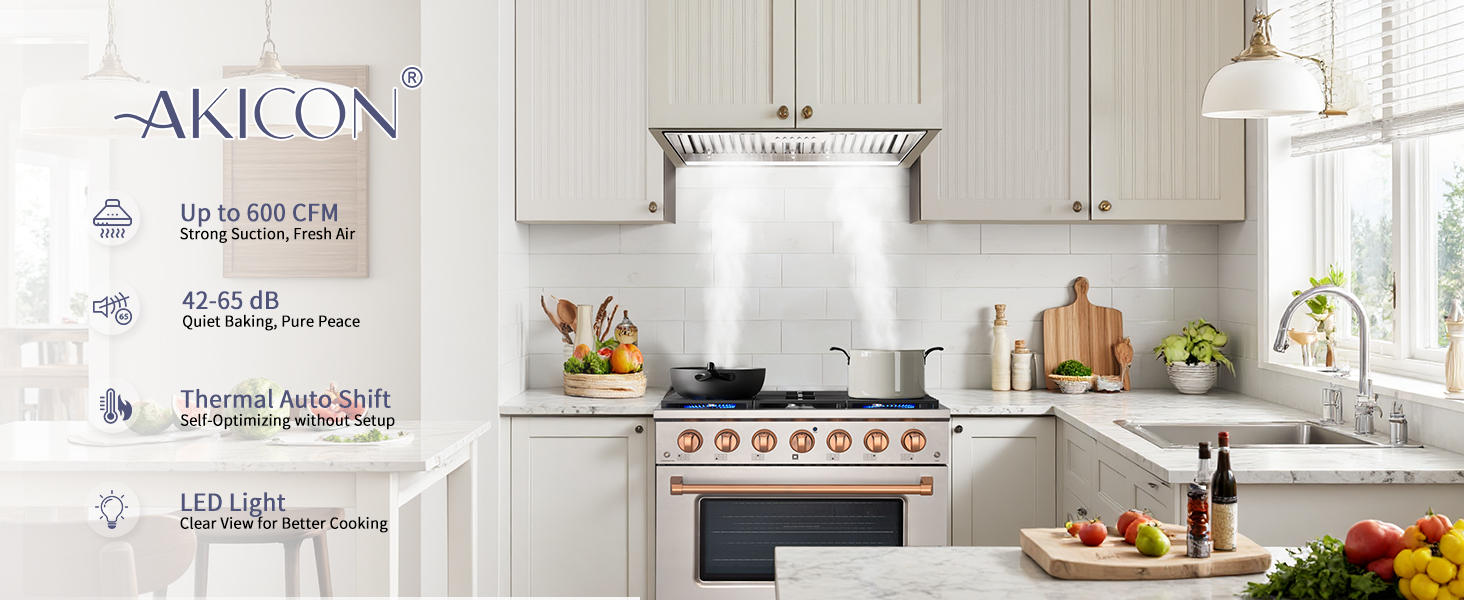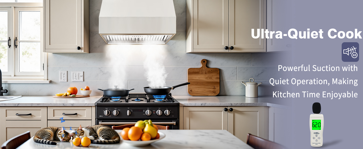 Ultra-Quiet Operation: Designed with advanced noise-reduction technology, this kitchen hood vent delivers Low noise, running at just 45 dB on the lowest setting. Even at maximum power, it maintains a peaceful 65 dB—quiet enough to enjoy conversations or listen to music without disruption, ensuring a serene kitchen environment