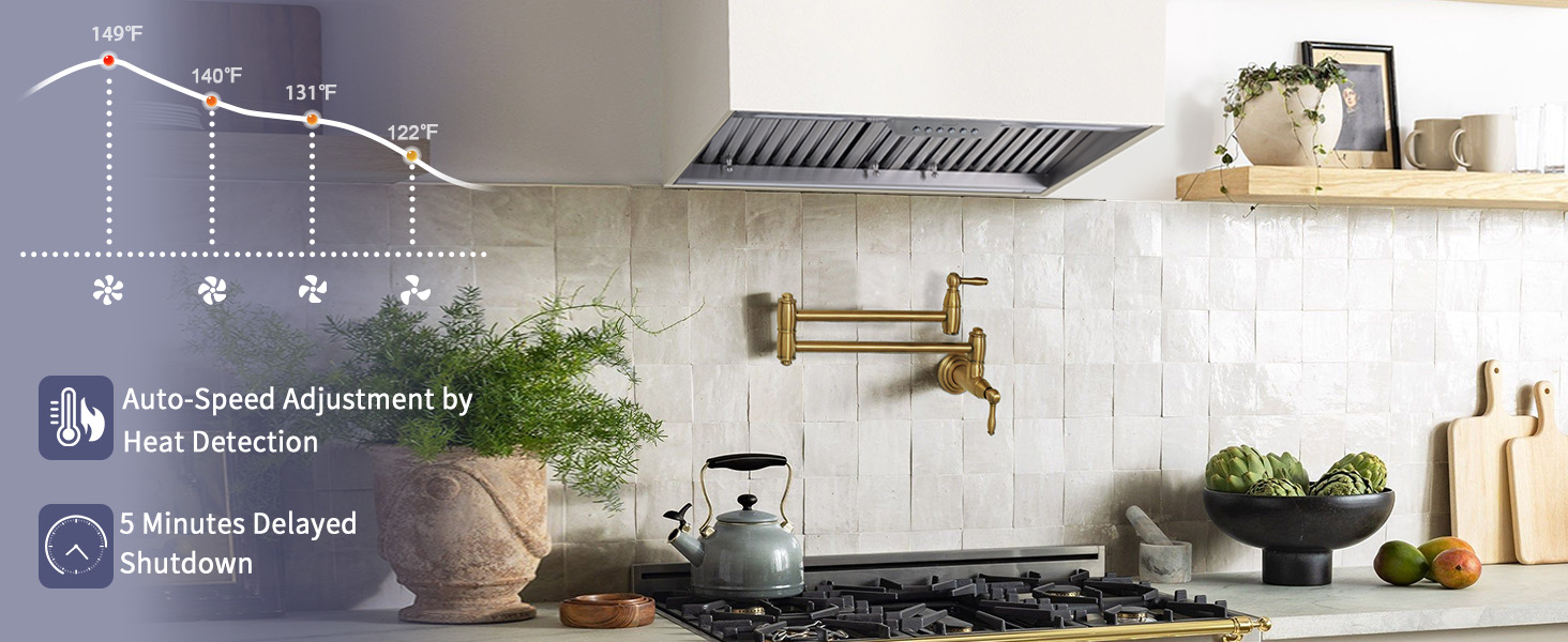 Thermosensitive Automatic Transmission:When the stove internal temperature exceeds 50°C, the stove vent hood automatically turns on and runs at 1 speed. For every additional 5°C increase, the fan speed rises by one level (up to Level 4 max). If the temperature drops, the fan speed gradually decreases but never goes below the lowest setting. The vent hood insert can be manually turned off or set to auto-shut down after a delay