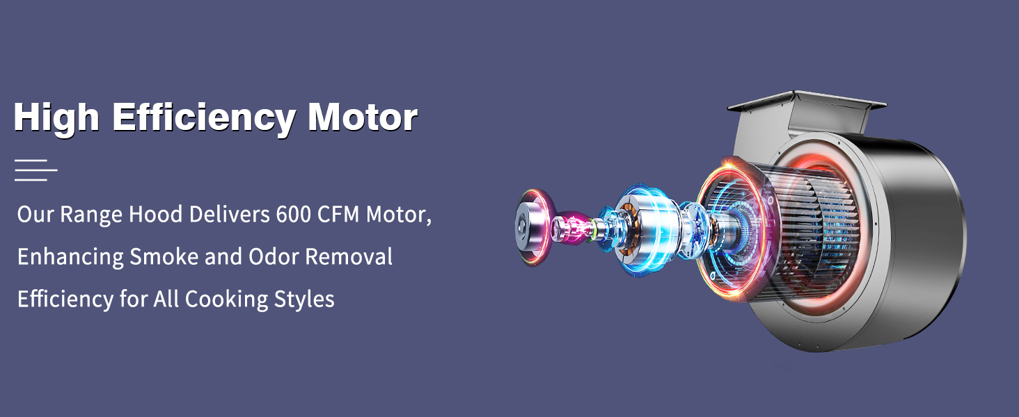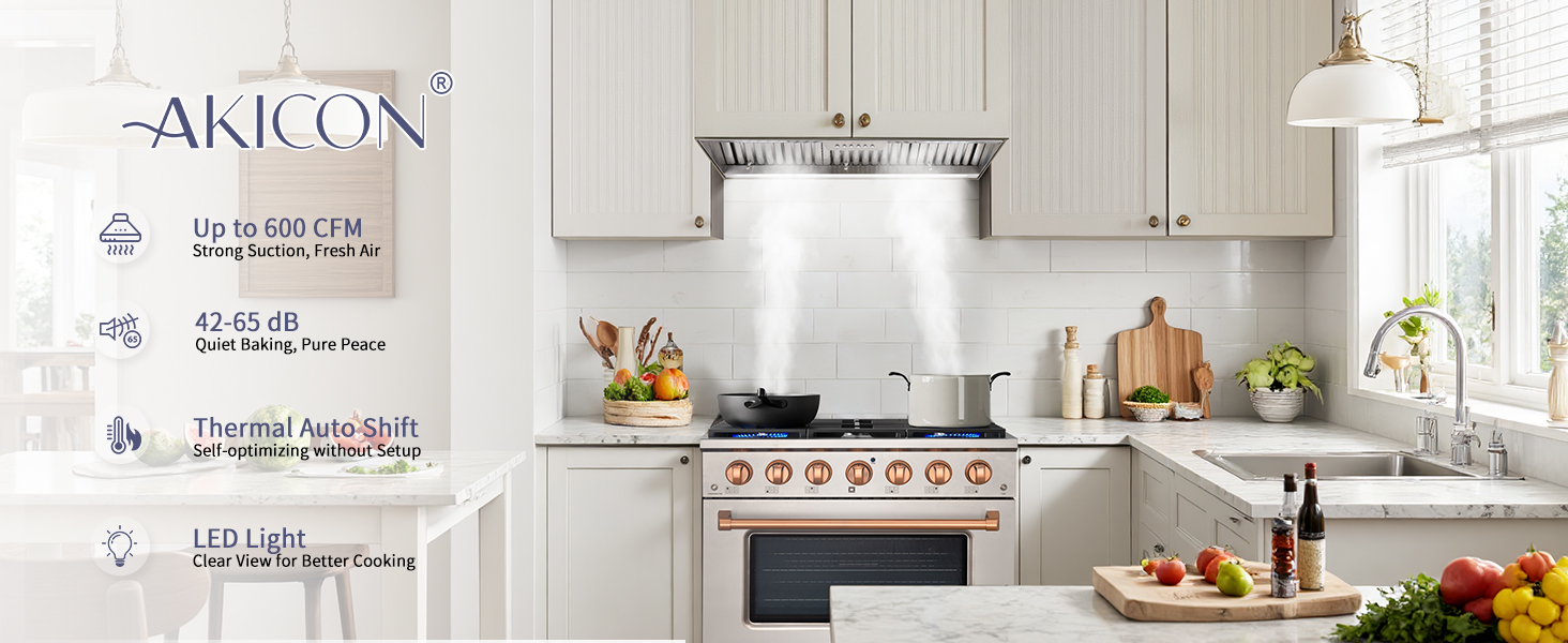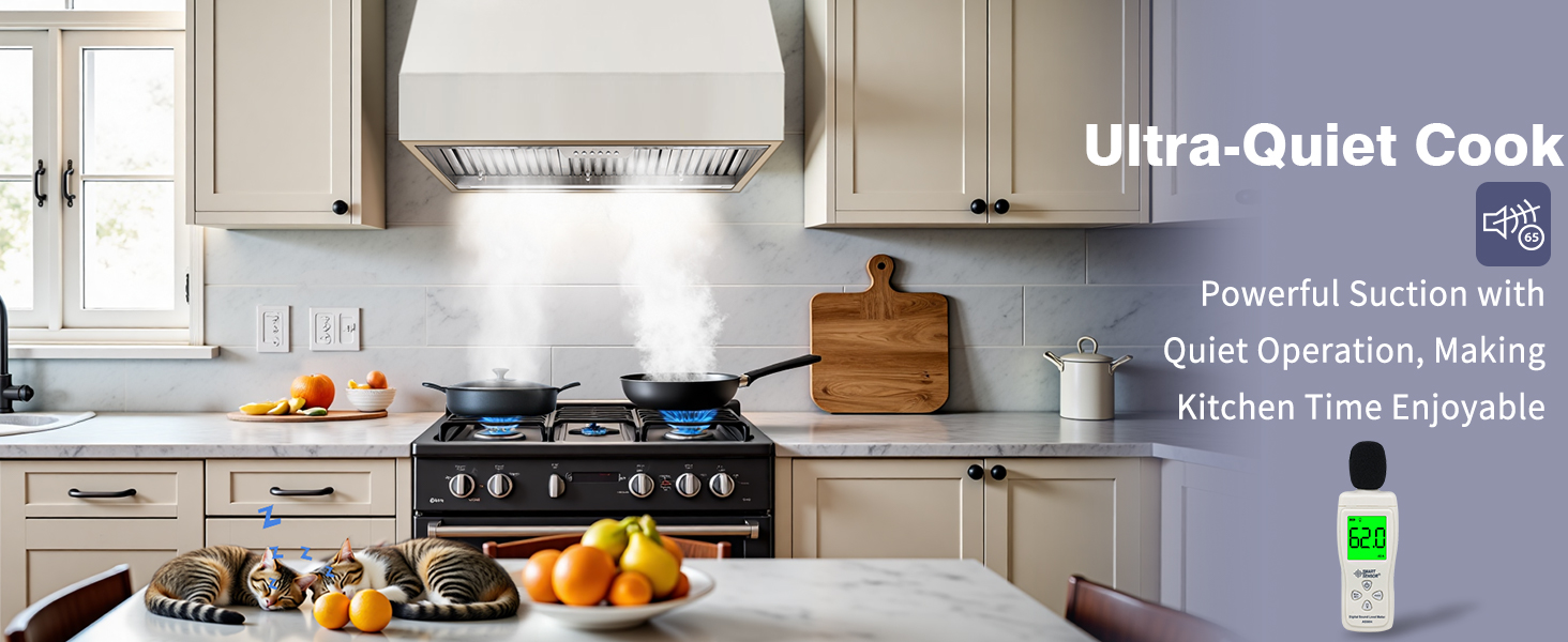 Ultra-Quiet Operation: Designed with advanced noise-reduction technology, this kitchen hood vent delivers Low noise, running at just 45 dB on the lowest setting. Even at maximum power, it maintains a peaceful 65 dB—quiet enough to enjoy conversations or listen to music without disruption, ensuring a serene kitchen environment