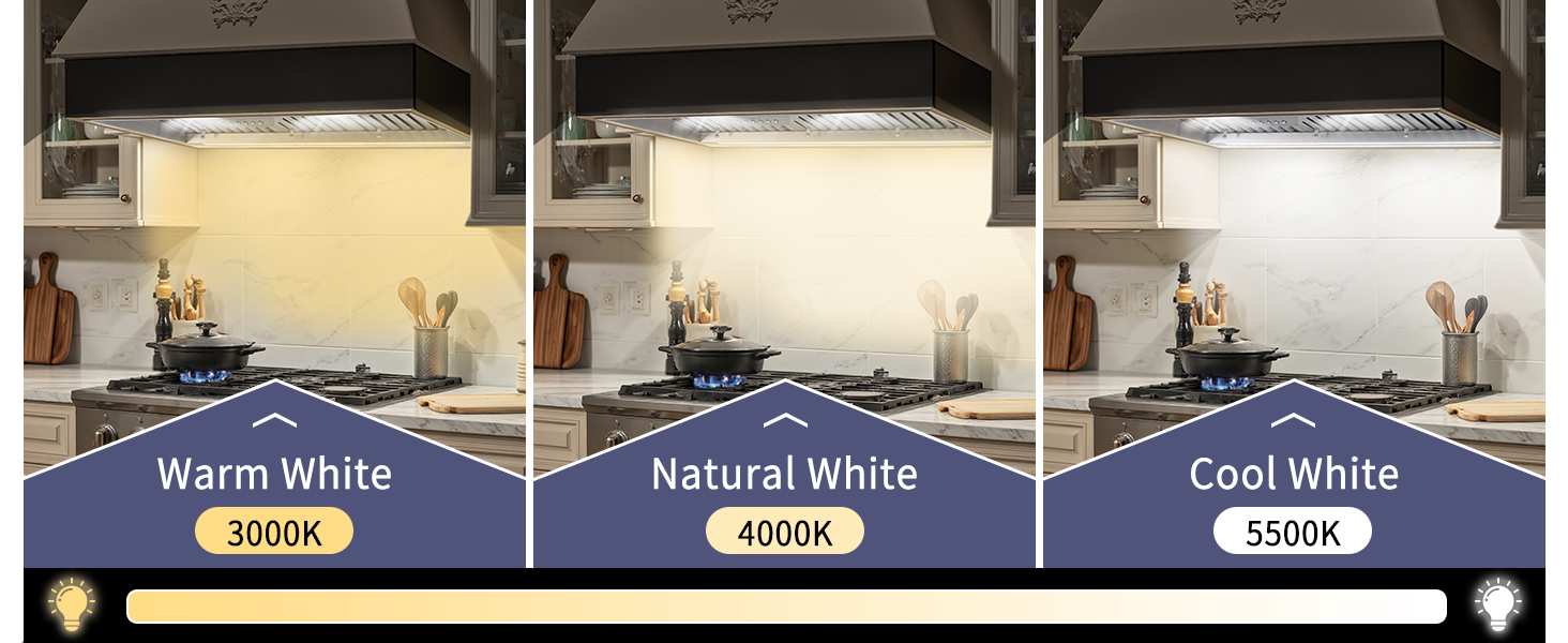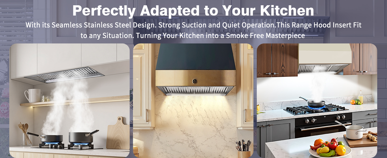 LED Light: Kitchen vent hood insert is Equipped with energy-efficient 3CCT LED lights (yellow,soft white, cool white) provide bright, flicker-free illumination. enhancing visibility during meal prep while creating a cozy atmosphere for gatherings