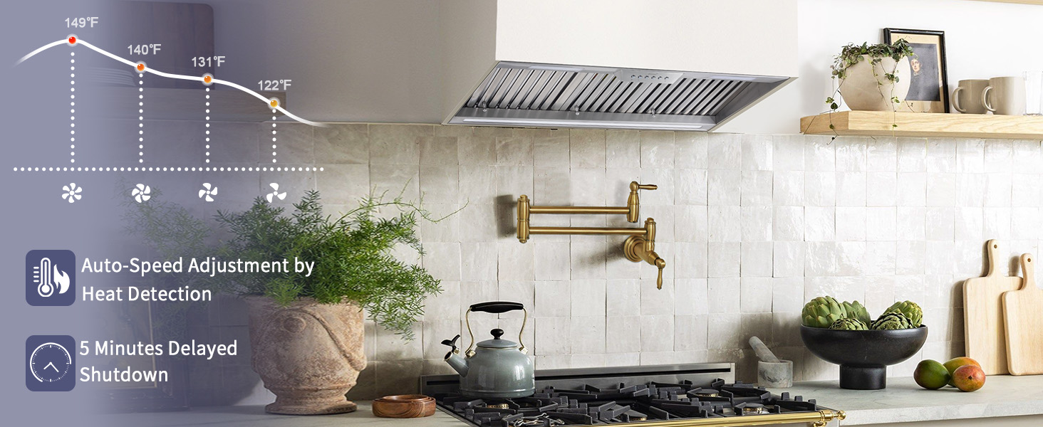 Thermosensitive Automatic Transmission:When the stove internal temperature exceeds 50°C, the stove vent hood automatically turns on and runs at 1 speed. For every additional 5°C increase, the fan speed rises by one level (up to Level 4 max). If the temperature drops, the fan speed gradually decreases but never goes below the lowest setting. The vent hood insert can be manually turned off or set to auto-shut down after a delay