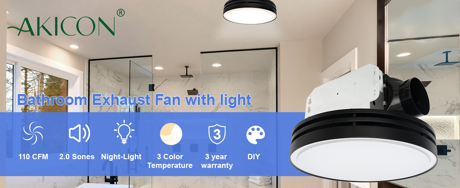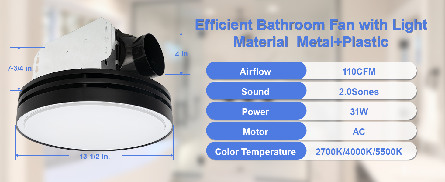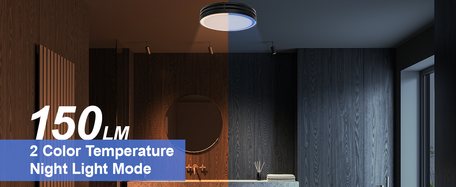 3CCT LED Light with Night: This vent fan contains LED main light and night light, The main light has 3 color temperatures-2700K warm white, 4000K natural white, and 5500K day white satisfying different needs. You can easily adjust the light color and exhaust fan using the adjustment switch.