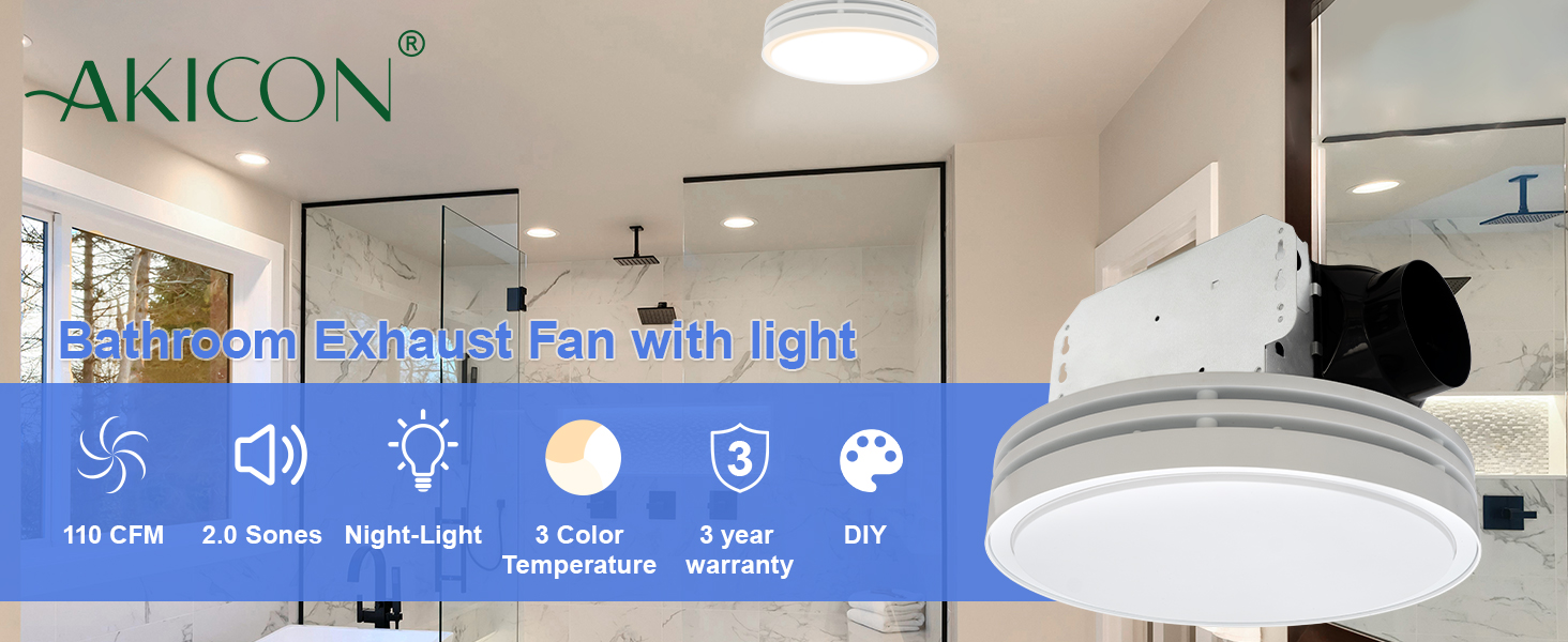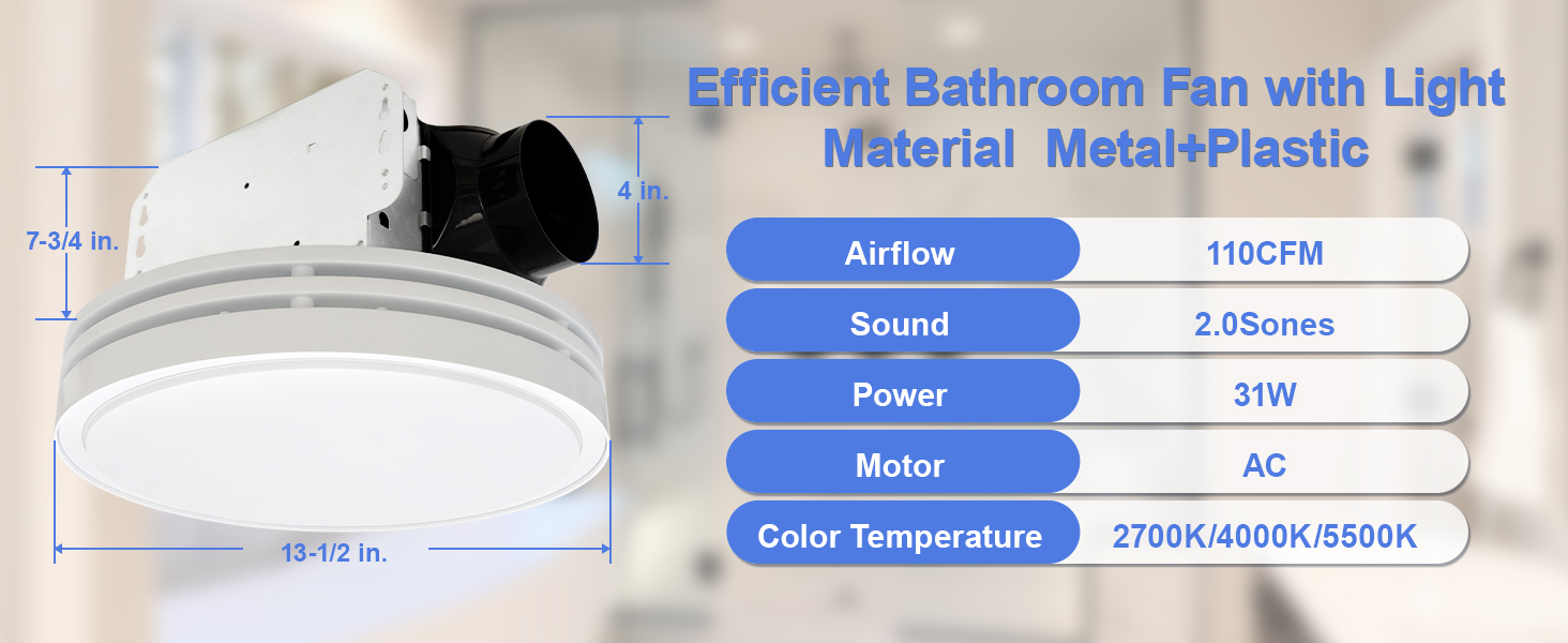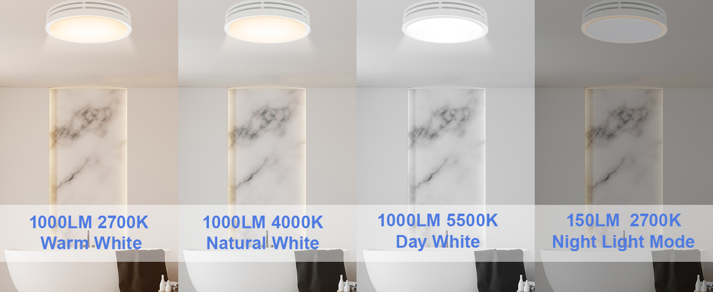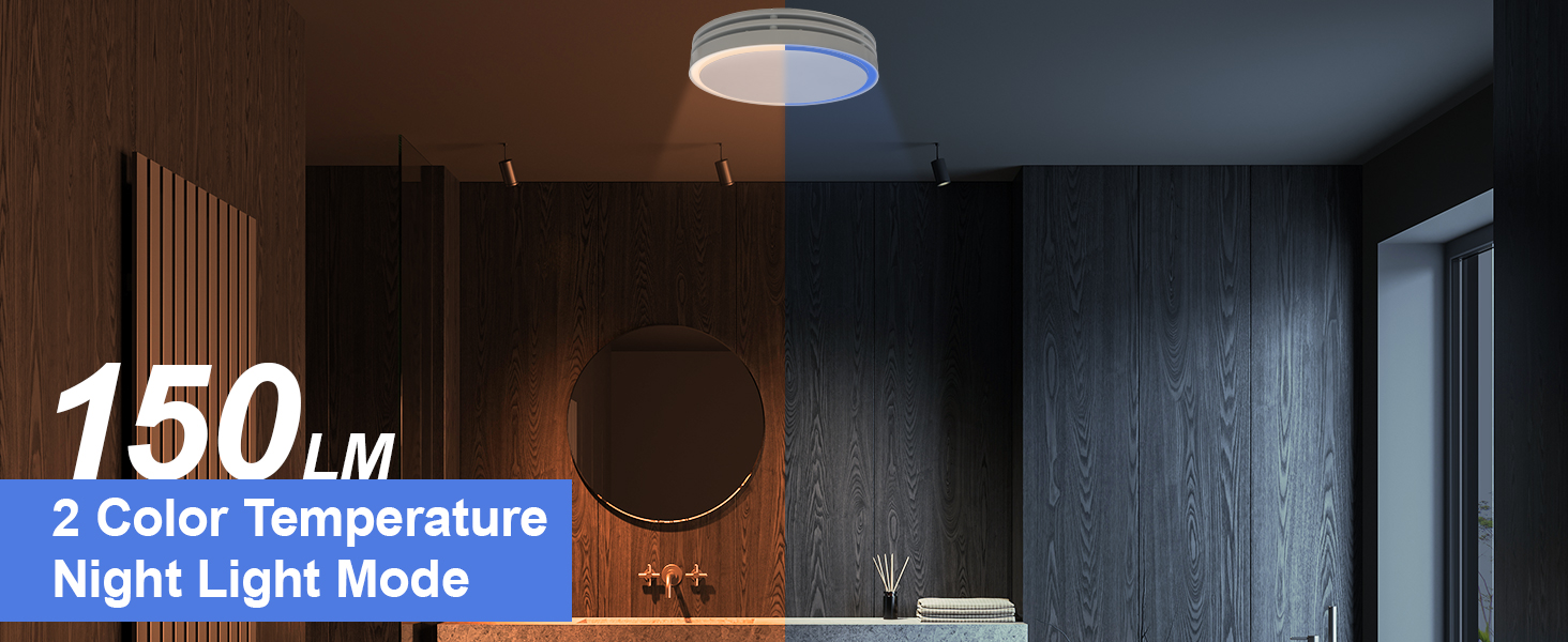 3CCT LED Light with Night: This vent fan contains LED main light and night light, The main light has 3 color temperatures-2700K warm white, 4000K natural white, and 5500K day white satisfying different needs. You can easily adjust the light color and exhaust fan using the adjustment switch.